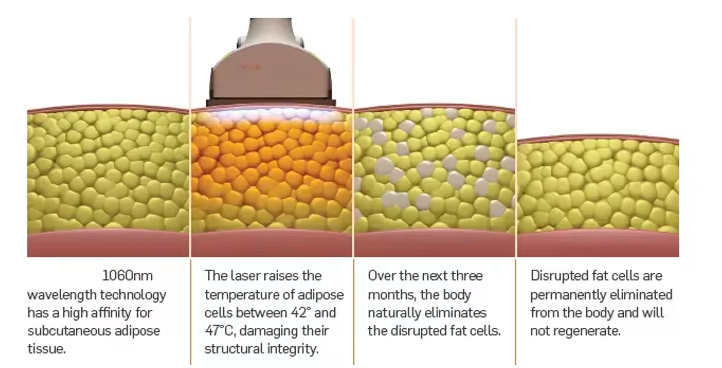 The subcutaneous fat is selectively heated to reach 42 to 47℃. total treatment 25mins.