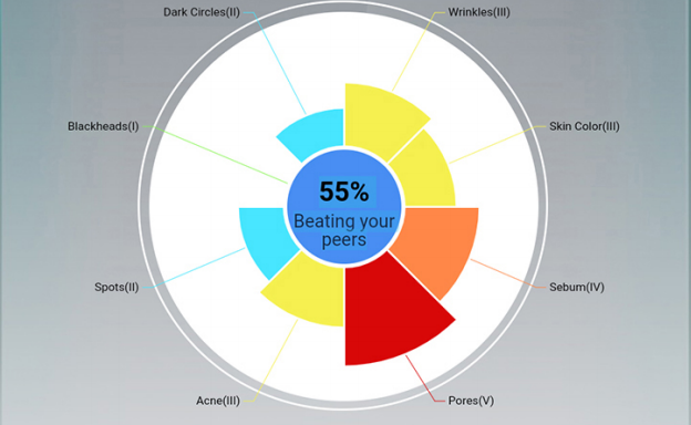 Interesting calculation of facial features (face value, face shape, eye shape, mouth shape, facial length ratio, and facial width ratio), skin structure map, surface comprehensive indicator map, deep comprehensive indicator map, skin attributes, skin overview, skin age prediction, comprehensive overviews and recommended scenarios.